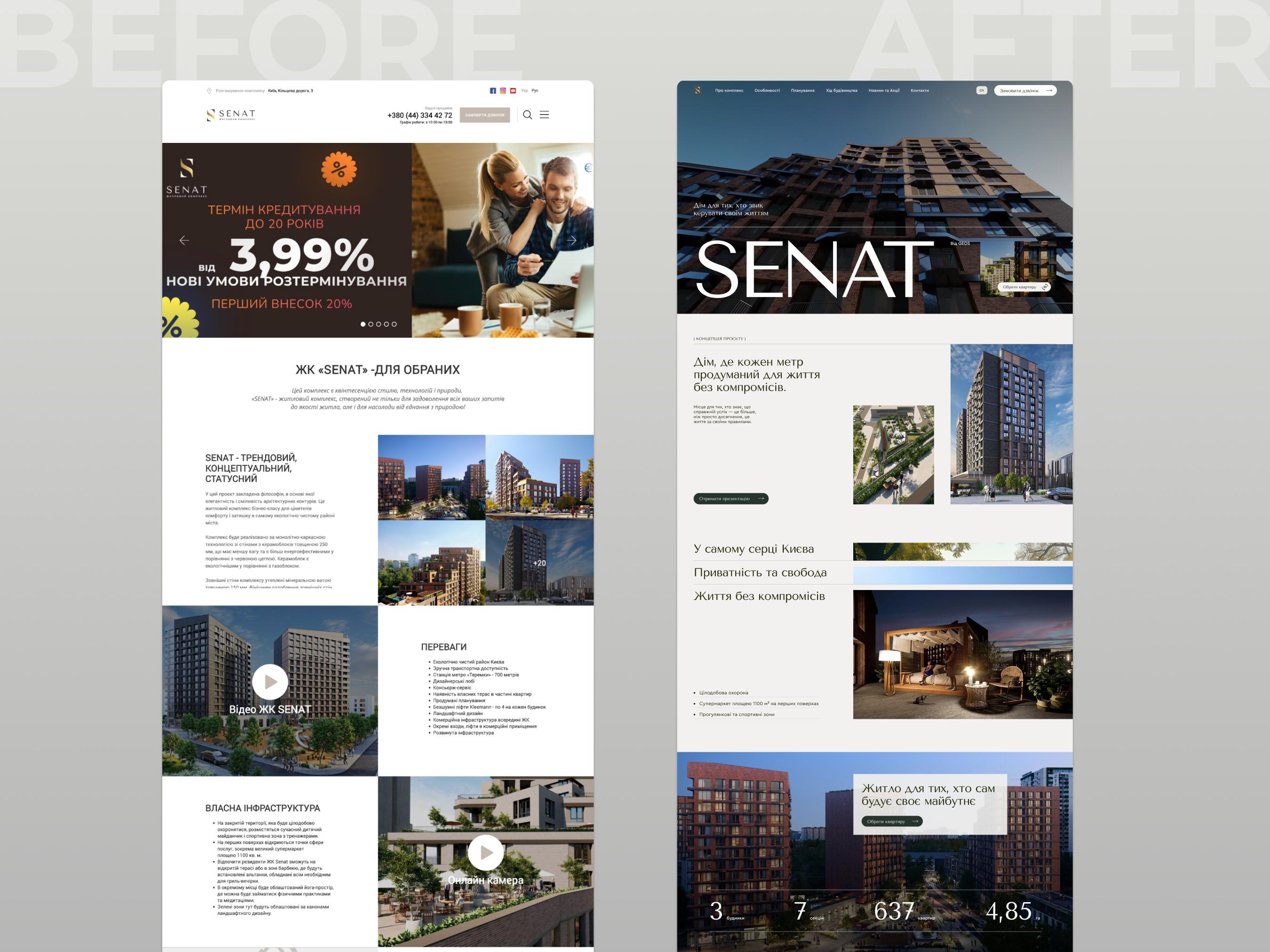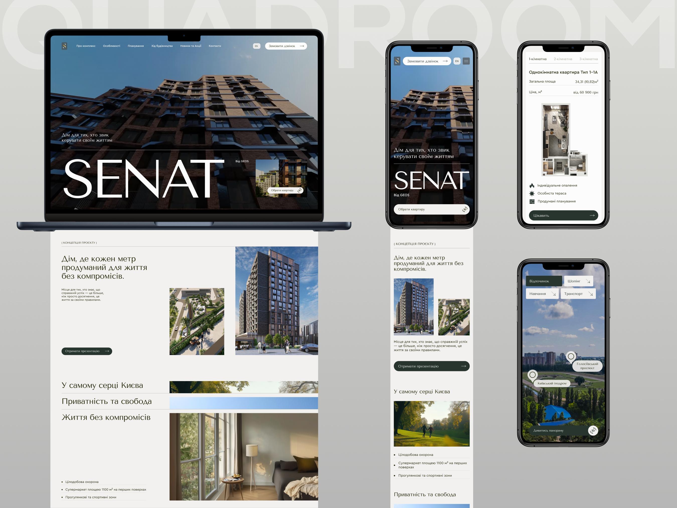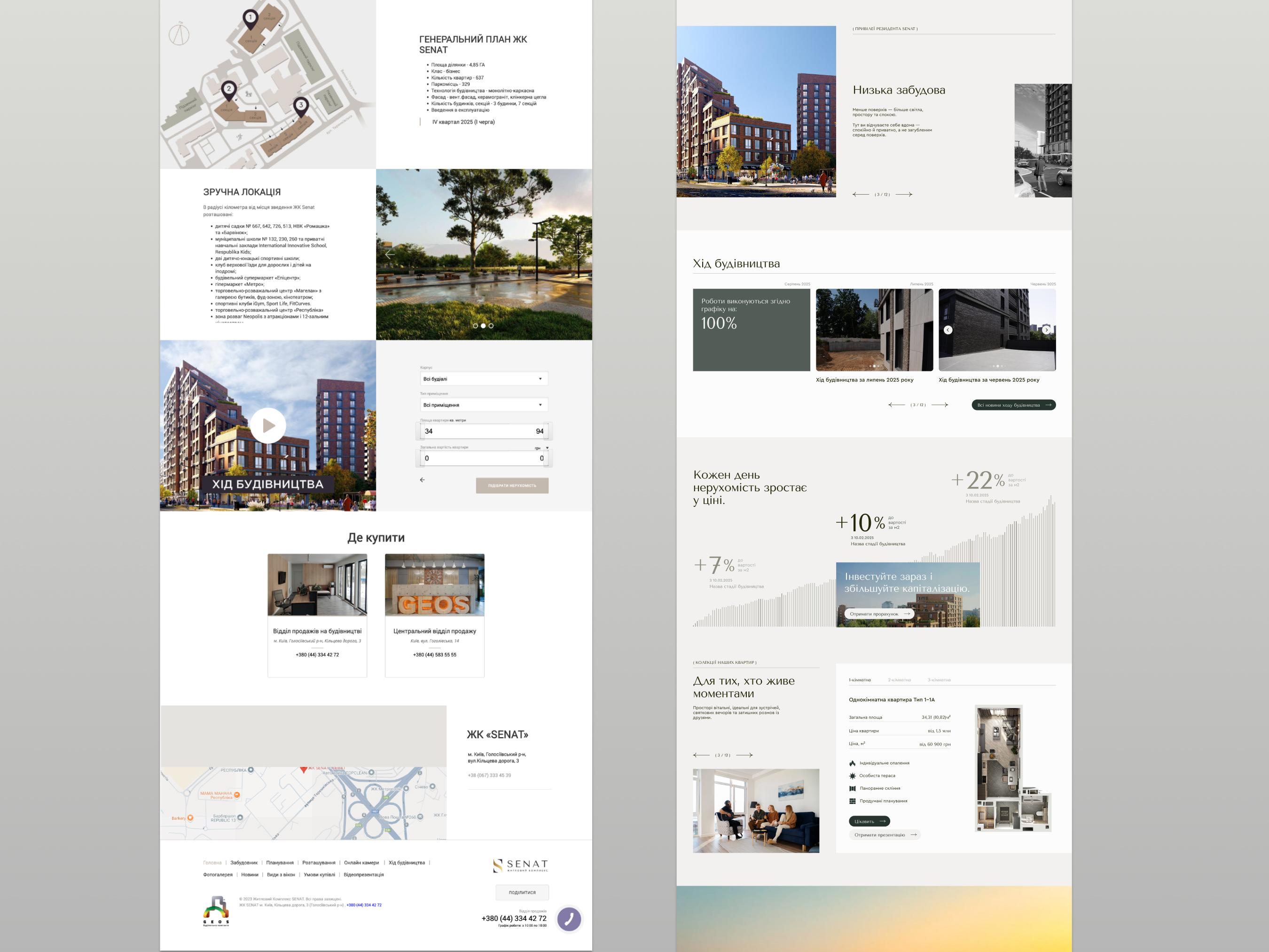 The Senat residential complex is situated in Kyiv's greenest district — Holosiivskyi. It stands out with modern architectural solutions, spacious rooftop terraces, and thoughtfully designed surrounding infrastructure. Despite the lengthy construction process and prime location near parks, a racecourse, and convenient transport connections, the existing website wasn't delivering the desired results.